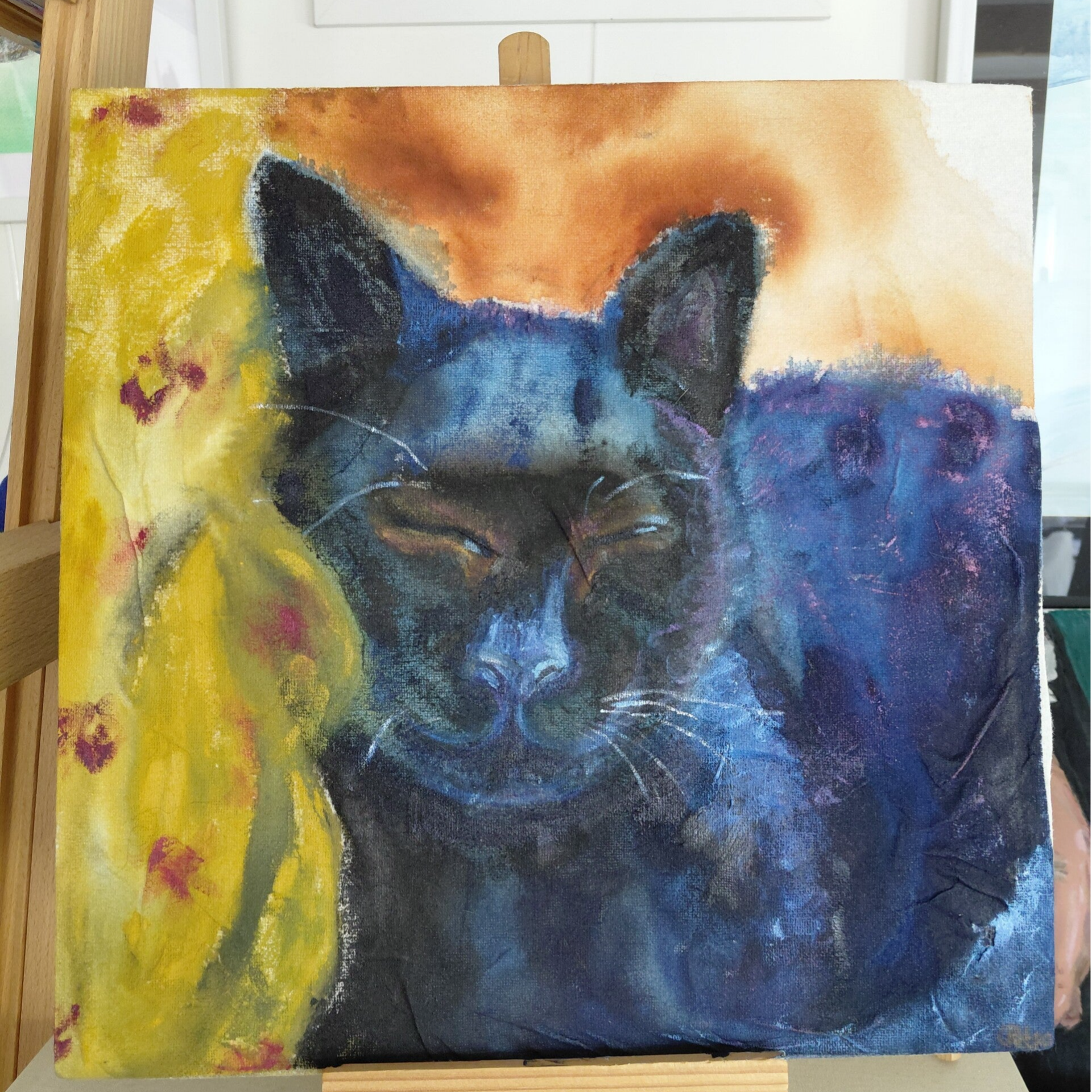 Zwarte kat. Olieverf op doekpapier, op board. 34,5x34,5 cm